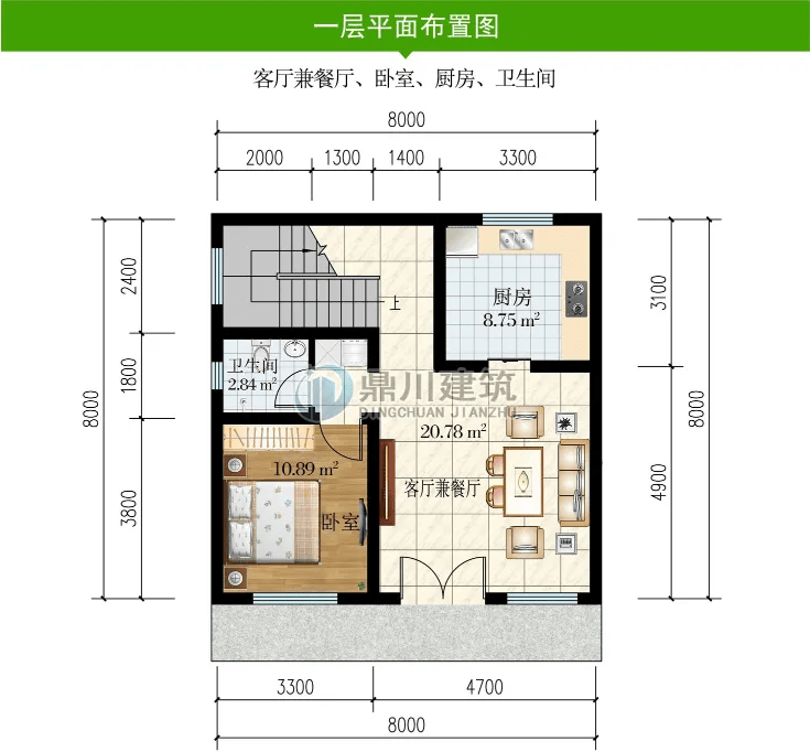 通过台阶入户即是客厅和餐厅,非常宽敞,厨房做独立式设计,避免油烟污染。一层设1间卧室,在卫生间附近,可做老人房,居住私密性强,起夜方便。