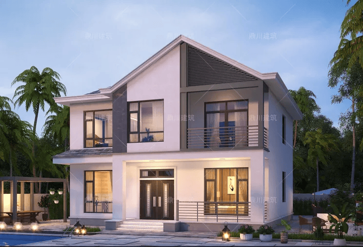 别墅共两层,主要采用的是现代风格,坡屋顶设计,造型简约外观时尚,灰白色外墙精美耐看,铁艺栏杆保护安全的同时,通透不遮挡视野,具有线条感。前后多窗,且有大落地窗设计,尽可能地保证了室内采光与空气流通,充满视觉美感,大气又漂亮。三级台阶设计抬高地基的同时,防止雨水倒灌,开有侧门方便进出。